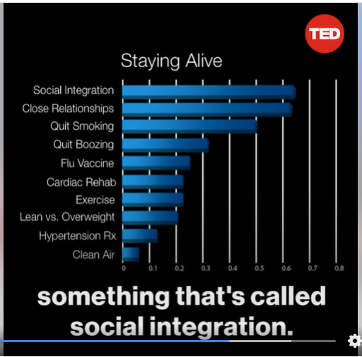 A research project led by Julianne Holt-Lunstad, at Brigham Young University, posed the question ‘what it would take to live to 100 years old and beyond’. The project covered 10s of thousands of middle-aged people, and she and her team looked at every aspect of their lifestyles. Their diet, their exercise, their marital status, whether they smoked, whether they drank, etc, etc. These were recorded at the start of the project and were updated during the project. The research team waited for seven years and then looked at the factors that influenced the people’s mortality. The results of the project are shown above. The two most important factors were social. Close relationships, having someone to turn too that could help in difficult situations, with money, sit with you if you are sick, need a lift to the hospital etc. Social interaction was the most important factor, and the key point was talking to people. Not just close family and friends, but anyone that you come in contact with.